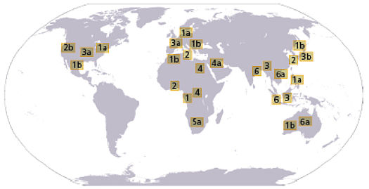 Worldwide distribution of HCV genotypes 1 to 6.